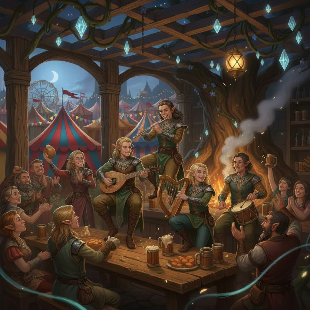 Our heroes found themselves with extra gold and time on their hands after their latest contract and decided some R&R is called for. Lucky for them a renowned and legendary caravan is coming to town, one of the Caravans of Eladris. Known for thrilling games, grand entertainment, and the “Feast of the Moon”, a storied event full of food and drink the likes of which are unseen in the worlds of Men and Dwarves. Though I caution you, heroes, the hospitality of elves is famous for its splendor and decadence, and infamous for its mystery and its effect on the mind and soul.