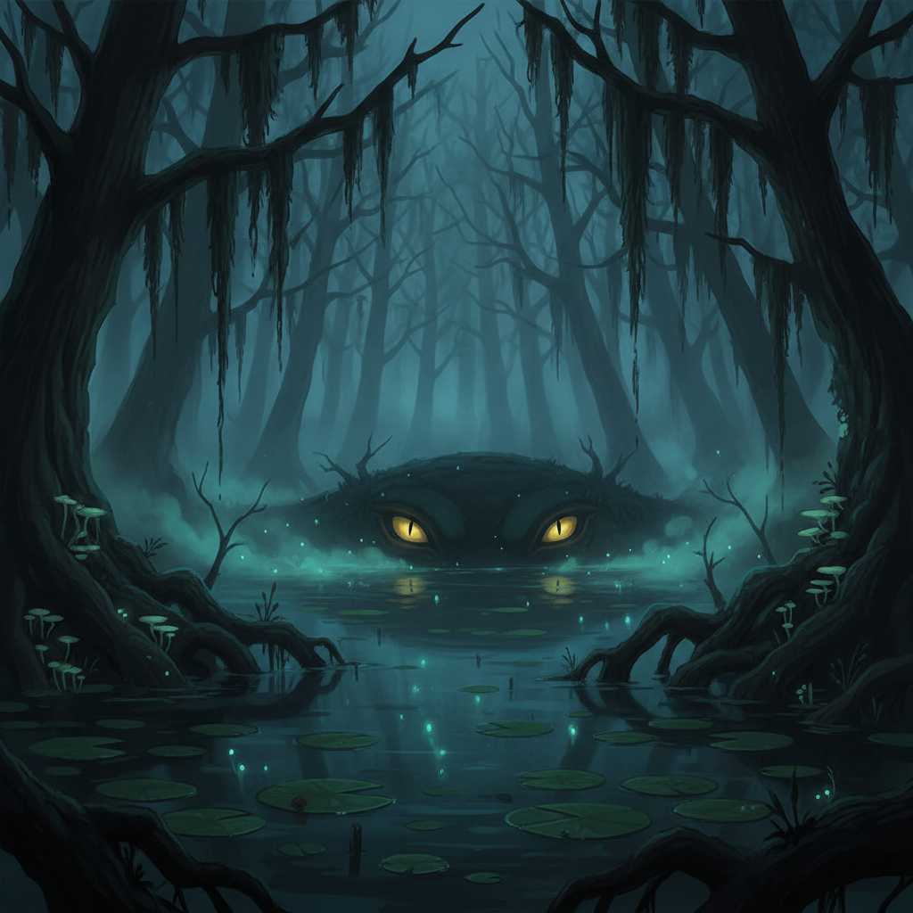 In the murky shallows and bogs of the Gloomhollow Marshes, there be stories as old as willows that tell tale of a gator the size of a hill. Gone by the name Two-Toed Tom, it be told he was the pet of the biggest of giants, but when they plum disappeared, it left ol Tom with no one to feed him. Its said that ol gator grew so large from eating that his steps made the very bogs and ponds of the marshes, and only after some cunning trappers drugged the poor beast did its hunger ever cease.