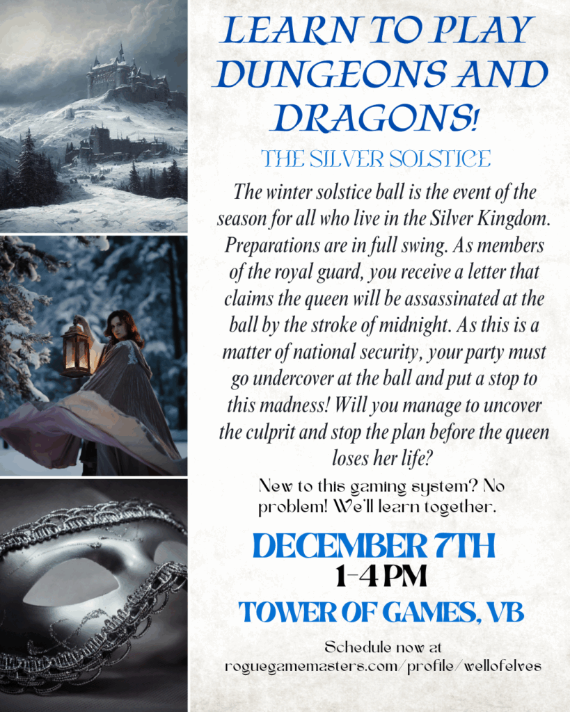 **IMPORTANT** Parental Responsibility Notice: While children ages 12+ are welcome at this table, parents/guardians must be present at the end of the game to pick up their child. Each game has a thirty minute ending window (in this case, 4-4:30 PM), meaning it may conclude at any time within that range. RGM and the venue are not responsible or liable for nay child left unattended due to late pickup. If you anticipate being late, it is your responsibility to contact the Game Master in advance and request they remain with your child. Please note, it is at the Game Master’s discretion whether they choose to wait.