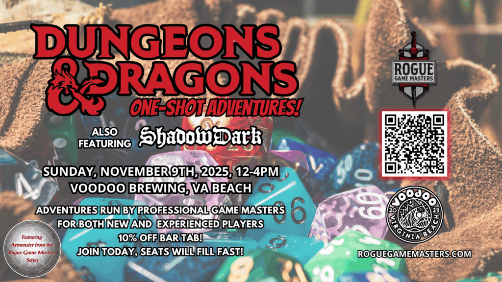 Thanks for your interest in our One-Shot event at Voodoo Brewing in VA Beach! Doors open at noon and the game starts at 12:30pm. This game includes: