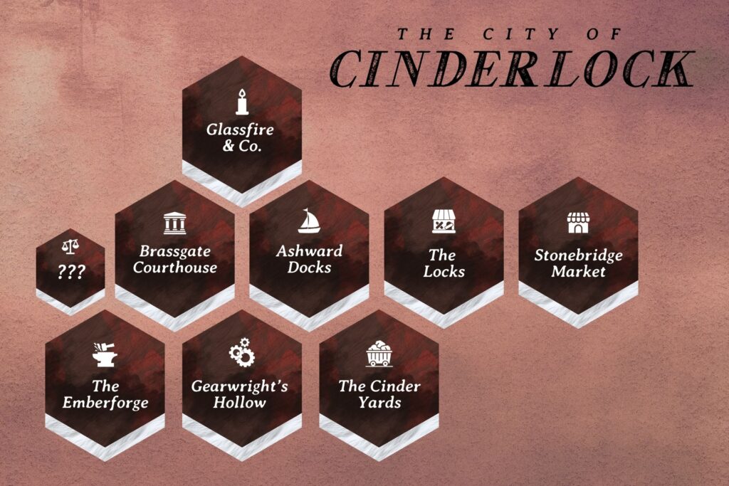 In the smog-choked city of Cinderlock, industry and invention drive the realm’s greatest empire of magical weapons and arcane machinery. The city’s power rests in the hands of three leaders—High Magistrate Keyra Korrin, Commander Selra Vann, and Lady Marcella Volante—together they maintain a fragile balance of power that keeps the city in check—though cracks are beginning to show.