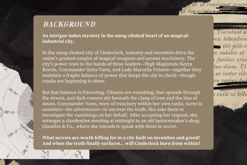 But that balance is fracturing. Citizens are vanishing, fear spreads through the streets, and dark rumors stir beneath the clang of iron and the hiss of steam. Commander Vann, wary of treachery within her own ranks, turns to outsiders—the adventurers—to uncover the truth. She asks them to investigate the vanishings on her behalf. After accepting her request, she arranges a clandestine meeting at midnight in an old lanternmaker’s shop, Glassfire & Co., where she intends to speak with them in secret.